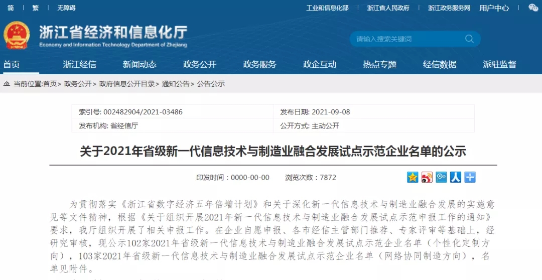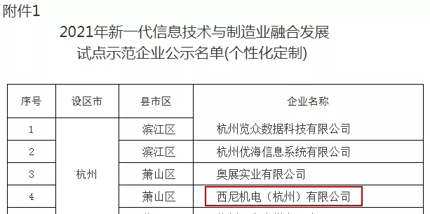 近日,浙江省經濟和信息化廳官網發布公示了“2021年省級新一代信息技術與制造業融合發展試點示范企業名單”,西尼機電基于“電梯產品快速定制設計制造能力”入圍,是兩化融合管理體系貫標方向——個性化定制細分中,杭州地區僅入選的八家企業之一。