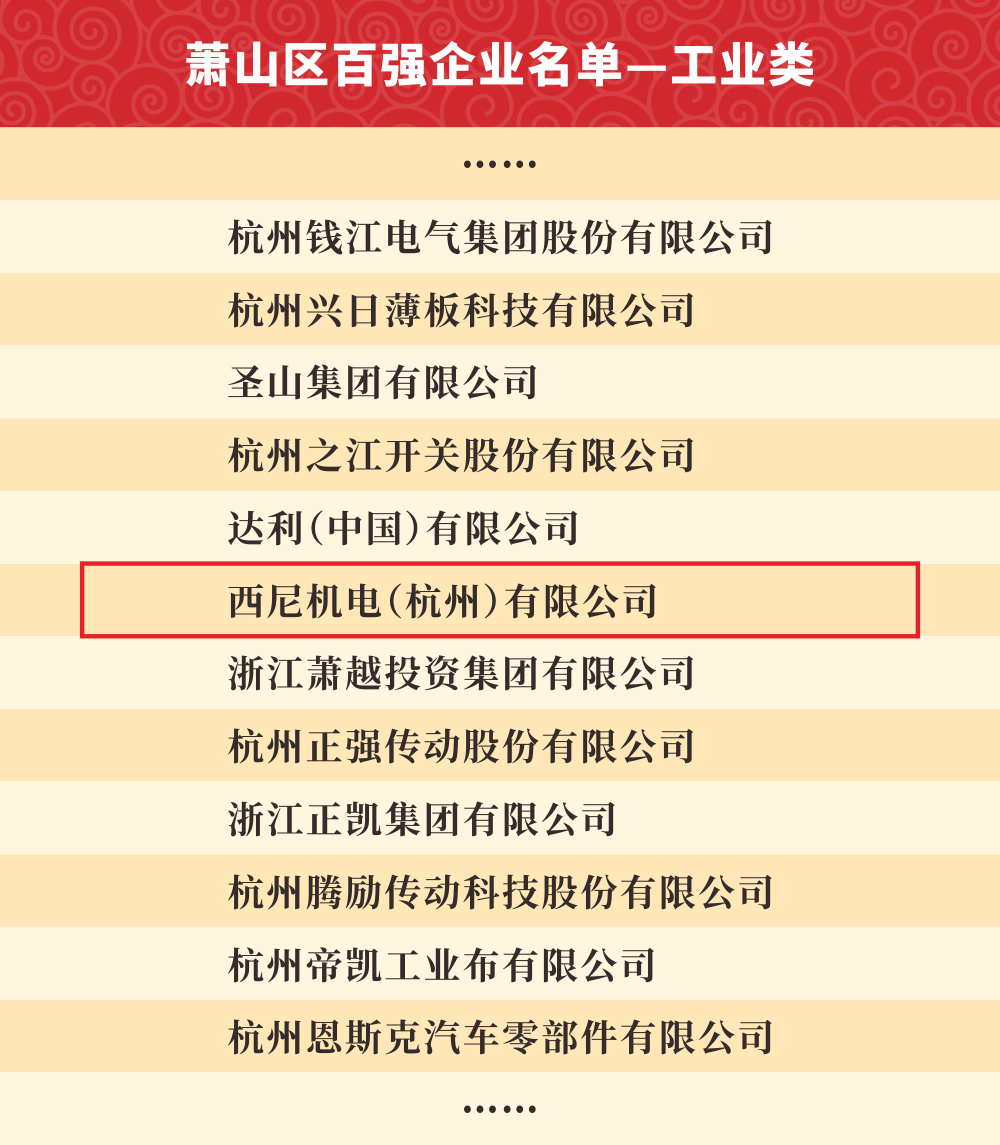 西尼機電多次入選“蕭山區百強企業”榜單。這一榜單是對我司綜合實力的展現,也是對西尼發展的充分肯定和鼓勵。在未來,西尼仍將堅持走高科技、高技術、創新化、高品質的國際化發展道路,不忘初心,砥礪前行,實現更高的經濟價值和社會價值。
